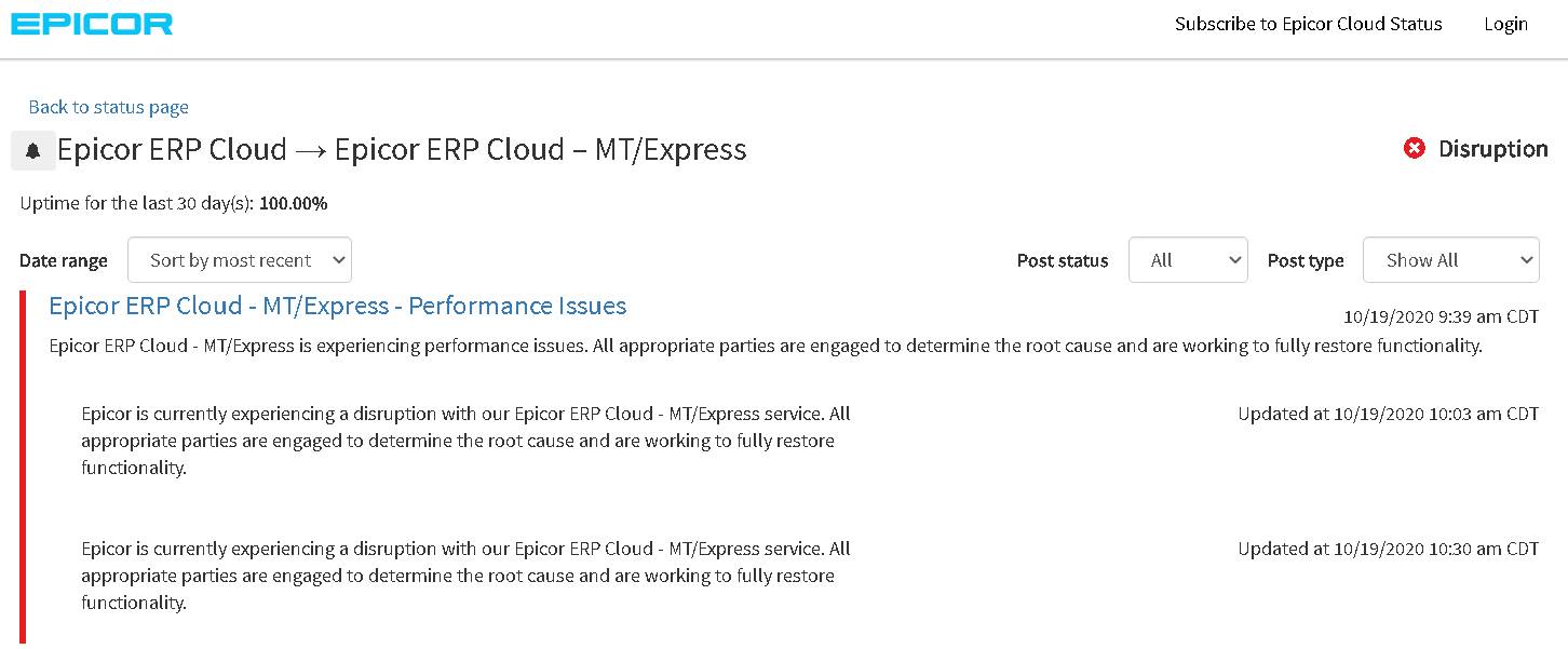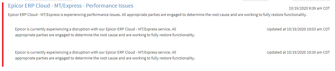 It seems you’re not alone. Well, MT/Express users. Other Public Cloud users (Dedicated Tenants) are not seeing this disruption.