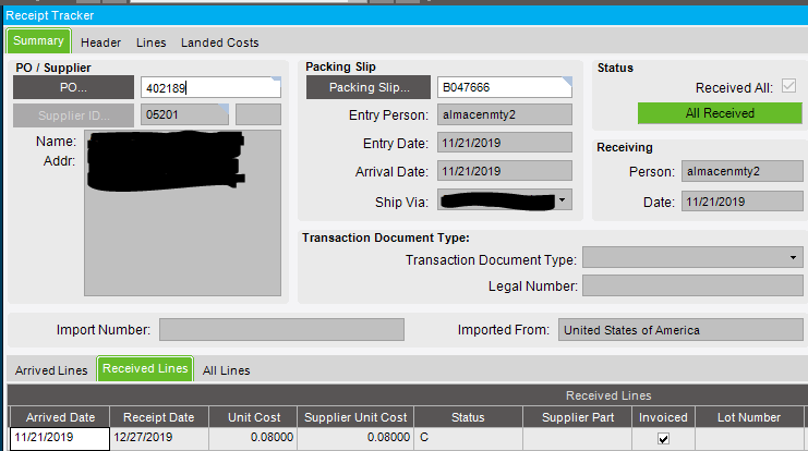 The receipt itself has it marked as received on 11/21/19 at the Summary level but it has an arrived date of 11/21/19 and receipt date of 12/27/19 at the Received Lines level: