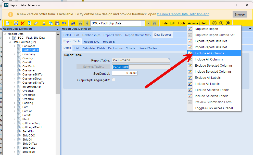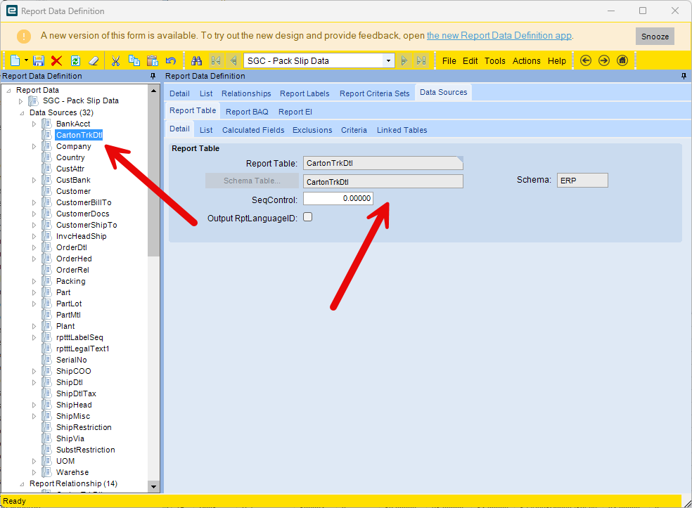 I chased this down this morning with a debugger, the issue is that the new Packing Slip report IF a Phantom is present assumes there is a “Data Source” (table) in the RDD called “CartonTrkDtl”