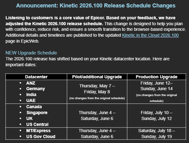 If anyone from Epicor is monitoring threads like this I would REALLY appreciate these announcements include when the upgrades will be available in the cloud management portal.