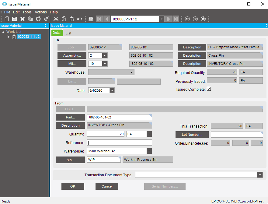 Initially I did have the same part number and it created the circular reference. I then created a new part number with a leading space and a description of INVENTORY to differentiate. I had Epicor on my PC for the last 45 minutes looking into the issue. No resolution as yet as all of the tables we queried show the correct lot. I am going to create a new part number (INV-802-05-101-02) and attempt to manufacture then issue. I will update on the progress.