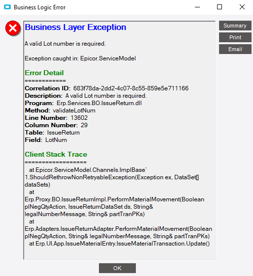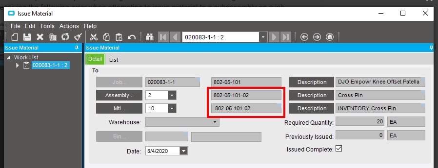 I am Receiving the following error when attempting to issue material to a subassembly on a job.