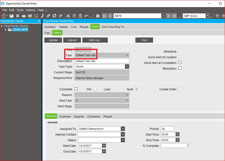 We have a default task (apparently in quotes, you have to have one task ticked as a ‘milestone’ as a minimum requirement) - ours is sequence number 10, default Task set - whereby the quote is ticked ‘won’ if it is converted to a sales order and ‘lost’ if it is not.