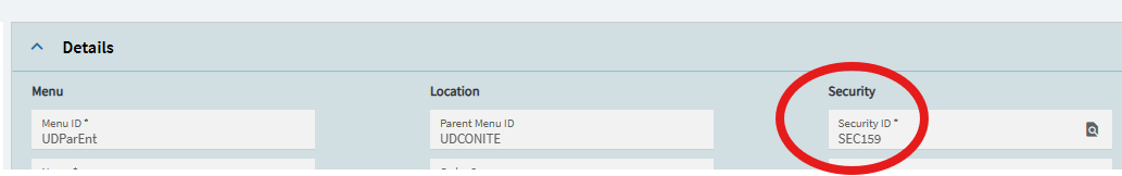 In Menu Maintenance if you select All it will let you search and you can enter the Menu ID and it will bring up that one that you can go into and see the values for Security ID.