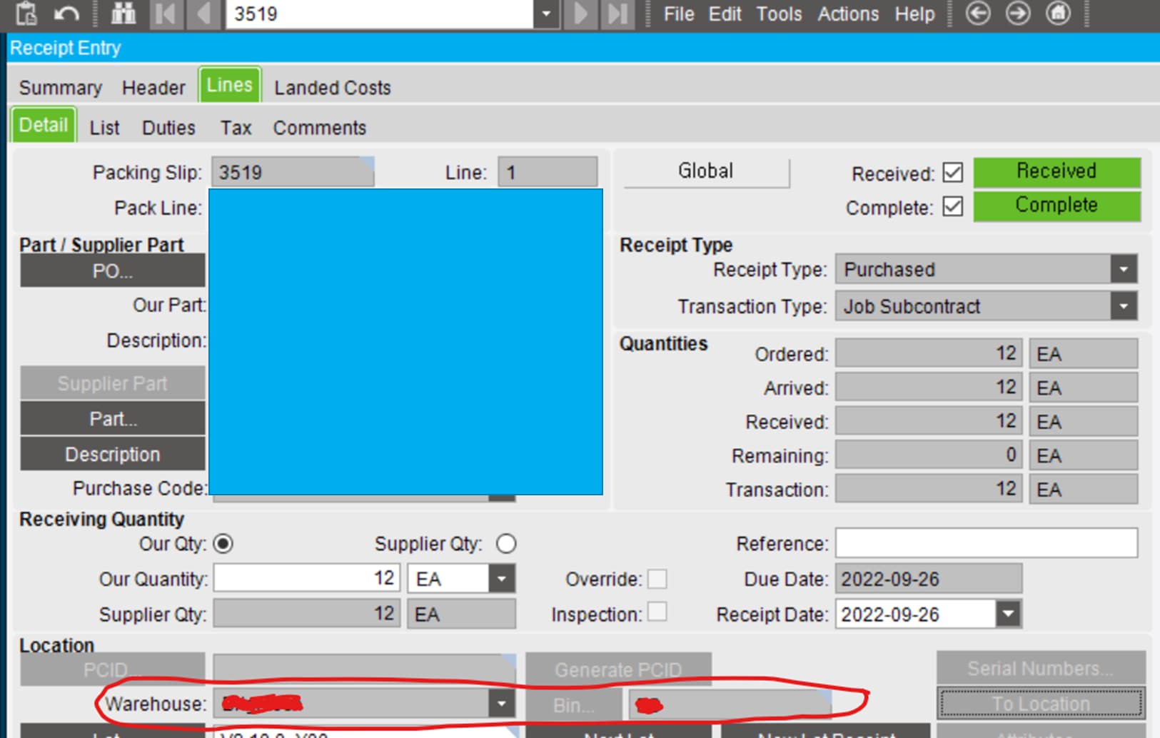 In Receipt Entry, when the type is Job Subcontract, the Warehouse/Bin field is disabled. This Warehouse/Bin seems to come from Part Maintenance.