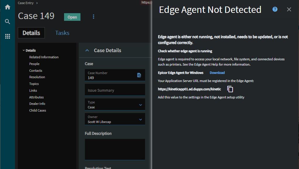 Here I’ll attach the Edge agent error on Case Entry Kinetic. Im aware of how to setup Edge Agent. I’m just trying to figure out why it’s forcing me to get edge. I’m suspecting [RunOnClassic] = 1