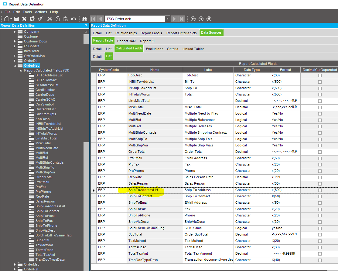 We are testing the Freight Forwarder address fields and would like to display these when printing the Order Ack. When I look at the RDD, I don’t see these fields and would like to add them. The basic ShipTo addresses all show up in calculated fields under OrderHed. Is there a way for me to add the FF address to this calculated area? Or, do I need to add a new table to the RDD?