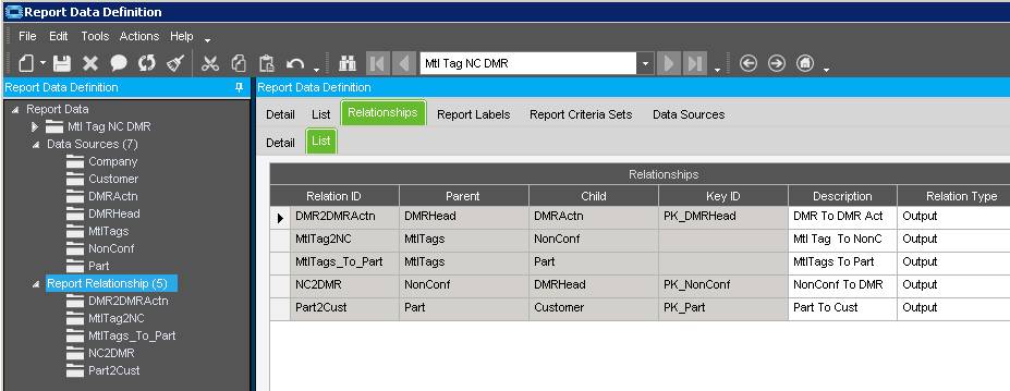 Modify your MtlTag Dataset in the SSRS report based on the last field in the query below with the (select statement) and try it. I recently modified my MtlTag while working on an autoprint method to include the Material Queue Sequence id in relation to the NonConformance Tran ID. And the method below worked since where dealing with a temporary table being generated for the MtlTag dataset.