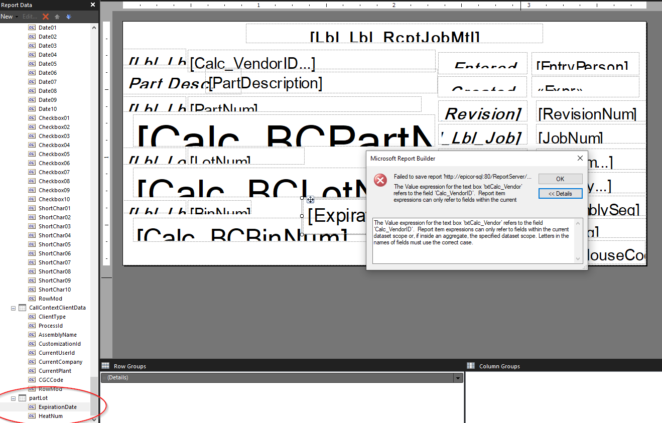 And the fields from the PartLot table will be added to the “RcvDtl” temp table used by the RDL. So no need to add the dataset in the RDL. Just update the Query for dataset RcvDtl in the RDL, and add the query fields too.
