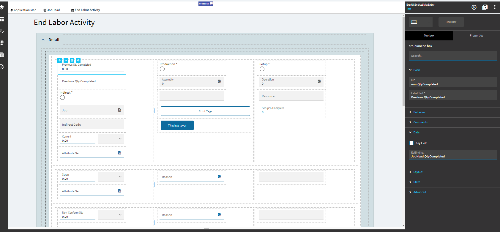 I did as suggested and hooked the call to the OnCreate for the control. What I did NOT do is do anything with TransView because I wasn’t clear whether that was required. I just bound everything to JobHeadAdd.QtyCompleted.