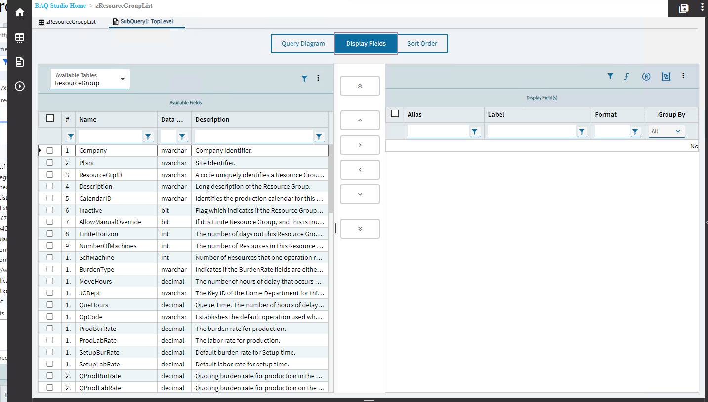 As you can see this uses the zResourceGroupList out of the box BAQ. When I open that BAQ up in BAQ designer (Kinetic version) it has zero columns on the display side.