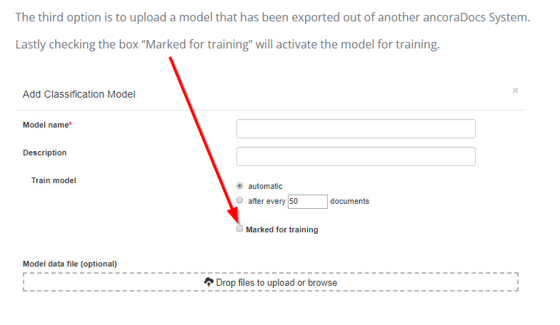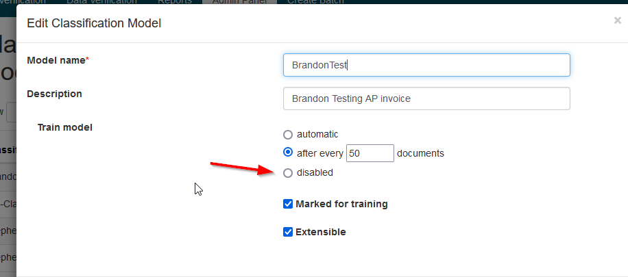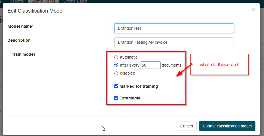 The only real settings that I see on the classification model are these. I don’t really understand what the radio buttons mean. What’s the difference between automatic, and after every x documents? Also what is “Marked for training” and “Extensible” mean?