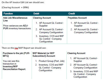 Within an AP Invoice, we are using the Job Misc Charges option for a line. This is usually used for freight on various parts that are purchased specifically for the job. The problem I have is that the financial transactions will not go to the WIP Account (which I thought was logical given it was a Job Transaction) and as such our WIP GL Balance is out of balance to our Sub Ledger.