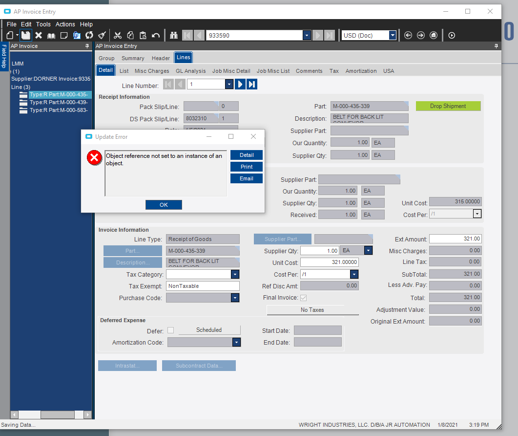 I have a part that was ordered on a sales order and marked to drop ship. Part was ordered and delivered to customer. Drop shipment has been entered. When I pull the line into my invoice the vendor charged more than was on the PO so I try and change the line to the correct total and get this error. Any idea why it won’t let me change the price?