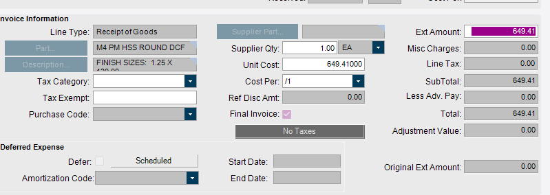 There are times where the pricing is different on the Invoice than it was on the PO, and the Invoice needs to reflect that, so we go into the Lines tab and make the change. In the example shown here the Ext amount is currently at $649.41 and I want to change it to $650.00 (adding $0.59 to the price).