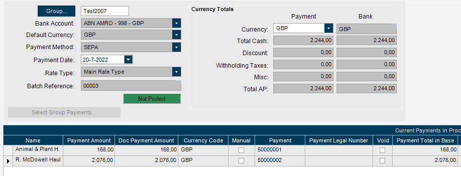 We have a separate LTD company, where we want to use batch payment instead of manual payment. I have entered a correct payment method, and used this as primary method with Bank Account Maintenance.