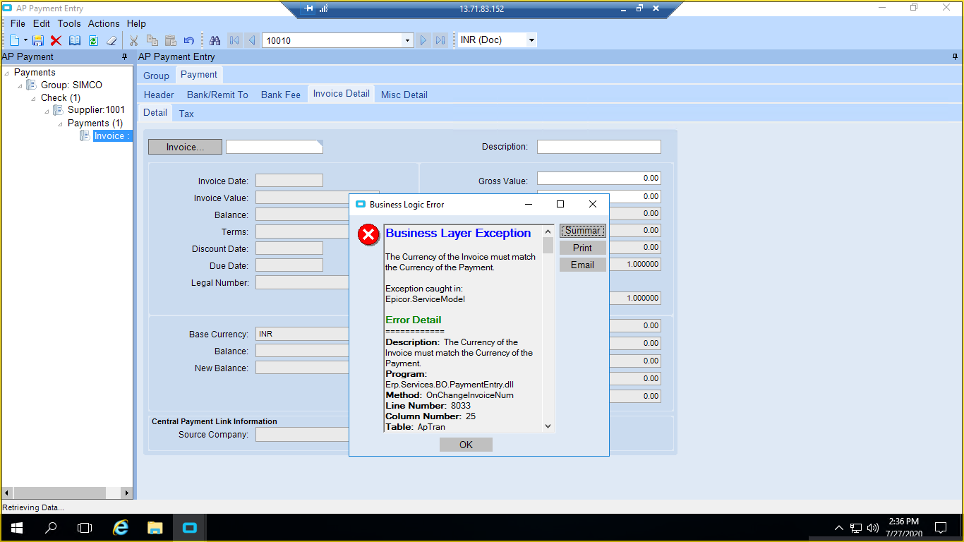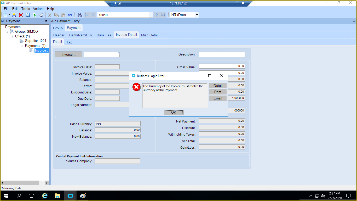 We have been facing an error while try to post an invoice. We have a invoice in USD,but we need to post that in INR. Is there any way to do this type of transaction in Epicor 10.