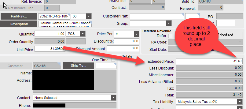 Extended Price round to 2 decimal place and this is epicor calculated field.