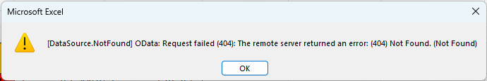 DataSource.NotFound: OData: Request failed (404): The remote server returned an error: (404) Not Found. (Not Found)