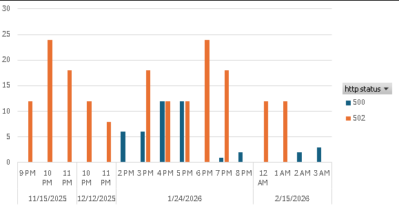 I’ve been writing 15 minutes logs from an integration I middleware’d several years ago, and I coincidentally happen to be reviewing the last few months today. Just for funsies as long as I’m here, here’s a low quality graph of the big HTTP error days from that period.