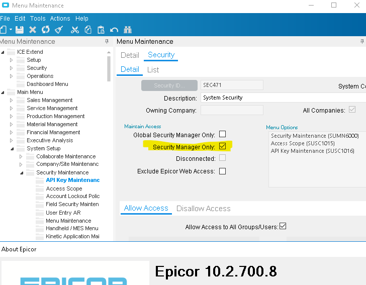 I am currently testing Epicor v10.2.700.8, upon which, my user account is configured with Security Manager privileges.