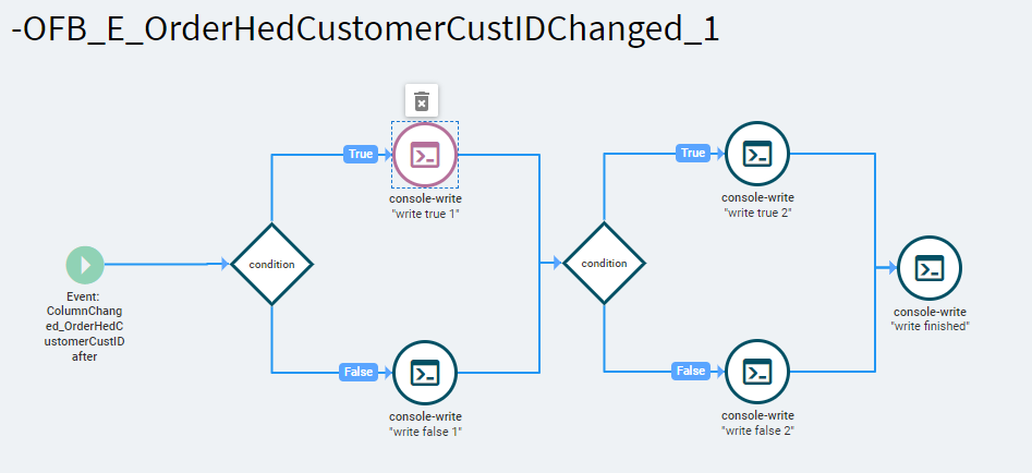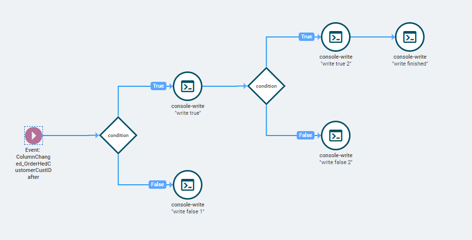 App studio happily lets me draw it this way, but when I debug/trace, it clearly show the first condition and first console-write executing, but it then just stops…doesn’t execute the 2nd condition.