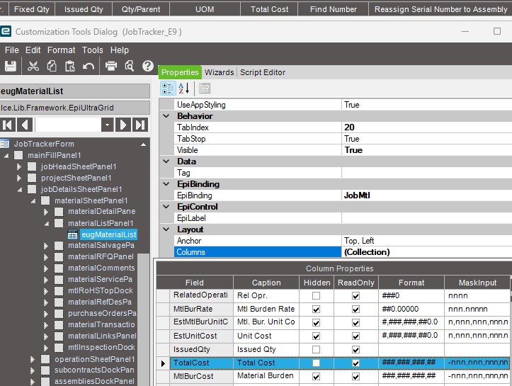 I am attempting to add the JobMtl.TotalCost column to the Materials Landing Grid in Job Tracker and experiencing weird results.