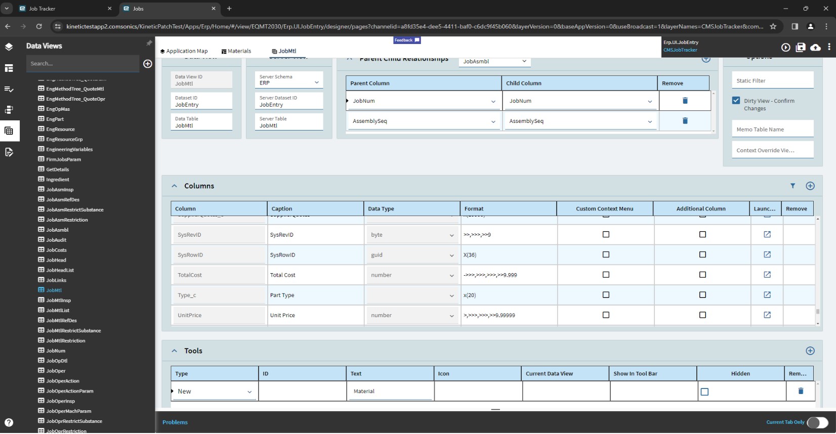 I was hoping TotalCost would just be hidden in Personalization in the Kinetic UI, but it wasn’t listed. I created a new Layer, found the Materials Landing Page, Edit, highlighted the grid, went to Data > Grid Model > Columns and added the TotalCost column as described in the Epicor Learning Center Course ‘My First Layer in Application Studio’ with properties entered as shown below.