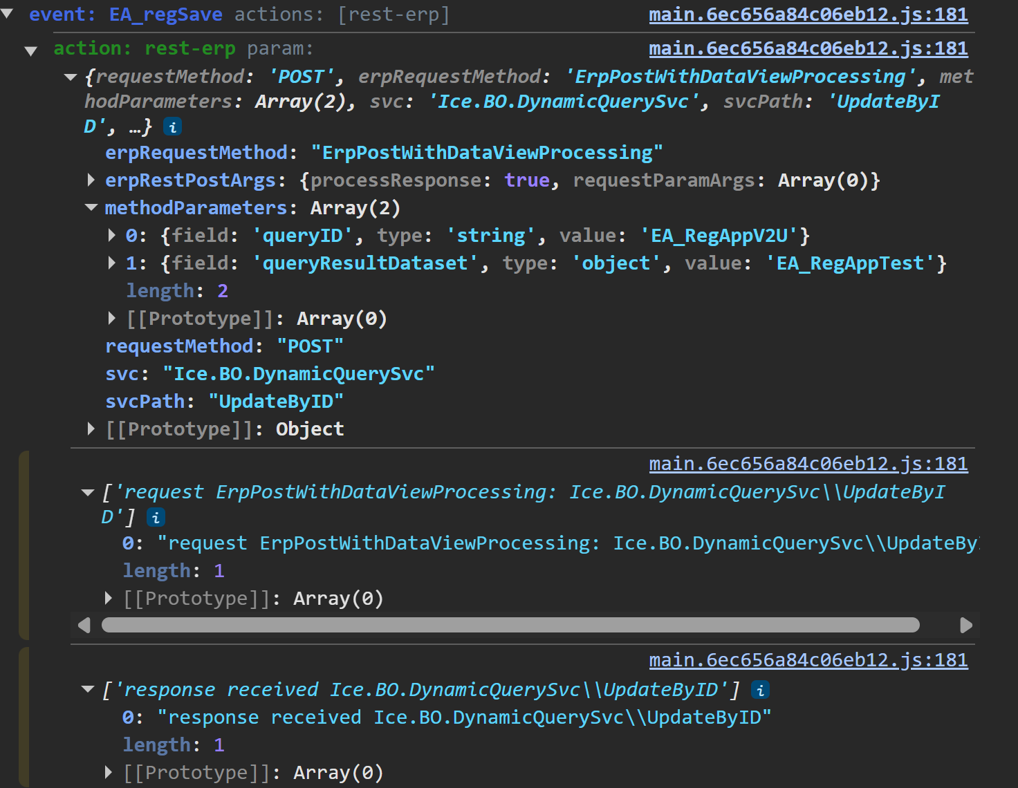 I see in the second link that there is a conversation about using the same widget used to call BAQs with parameters silently. However, instead of executebyid it uses updatebyid. This does not include the executionParams option in the method parameters section. Trying to add a parameter here only lets me include strings and not datasets like in the executebyid version.