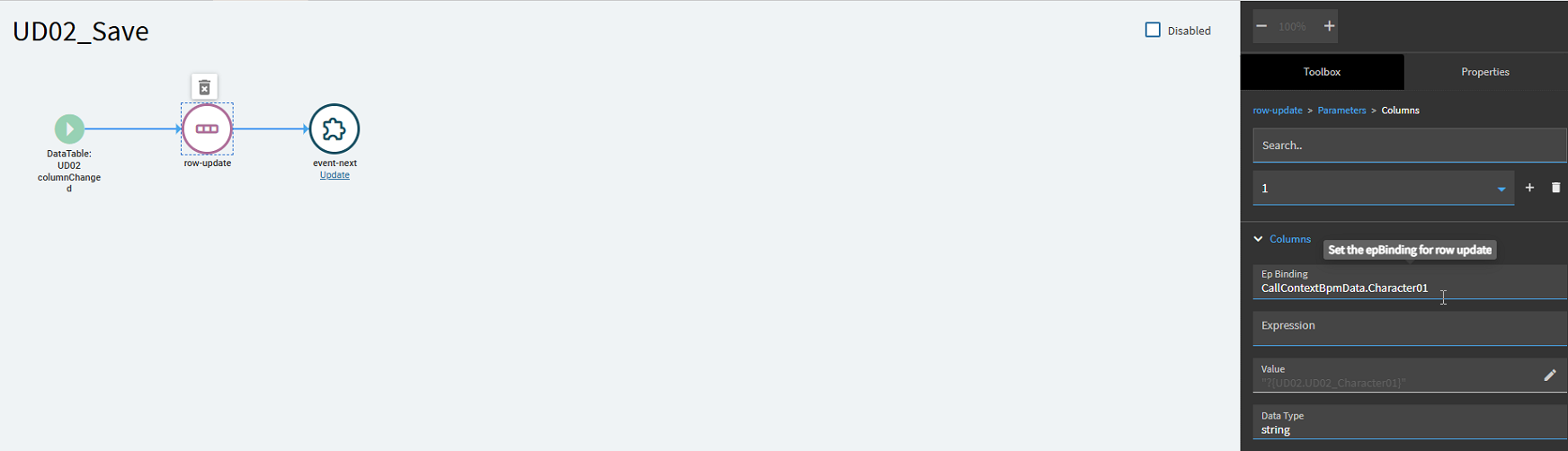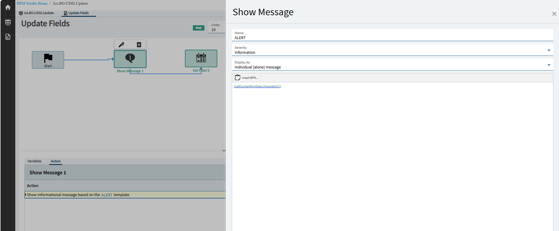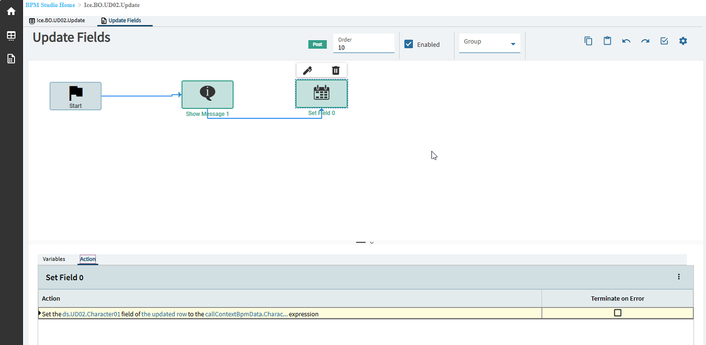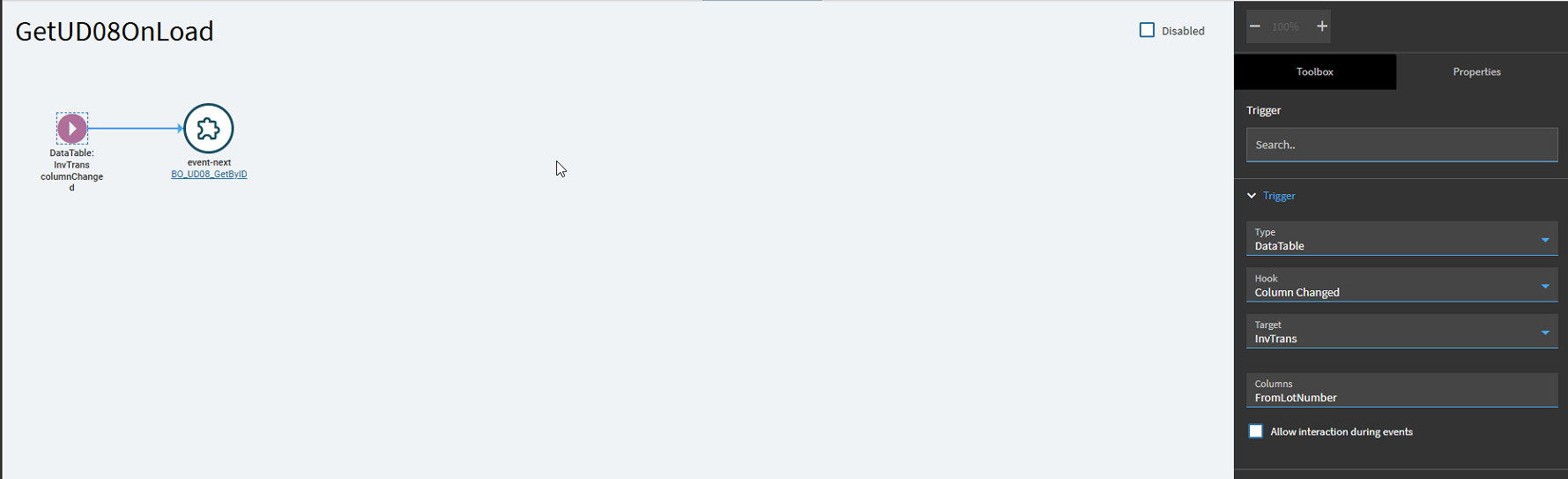 Again, not sure why just updating it in a bpm didn’t work but this did so I’ll take it. Next step we need to load the event, I decided to create a separate event for the load trigger in case I need to reuse the BO_UD08_GetByID, it wasn’t necessary, but this feels like best practice, so I did it.