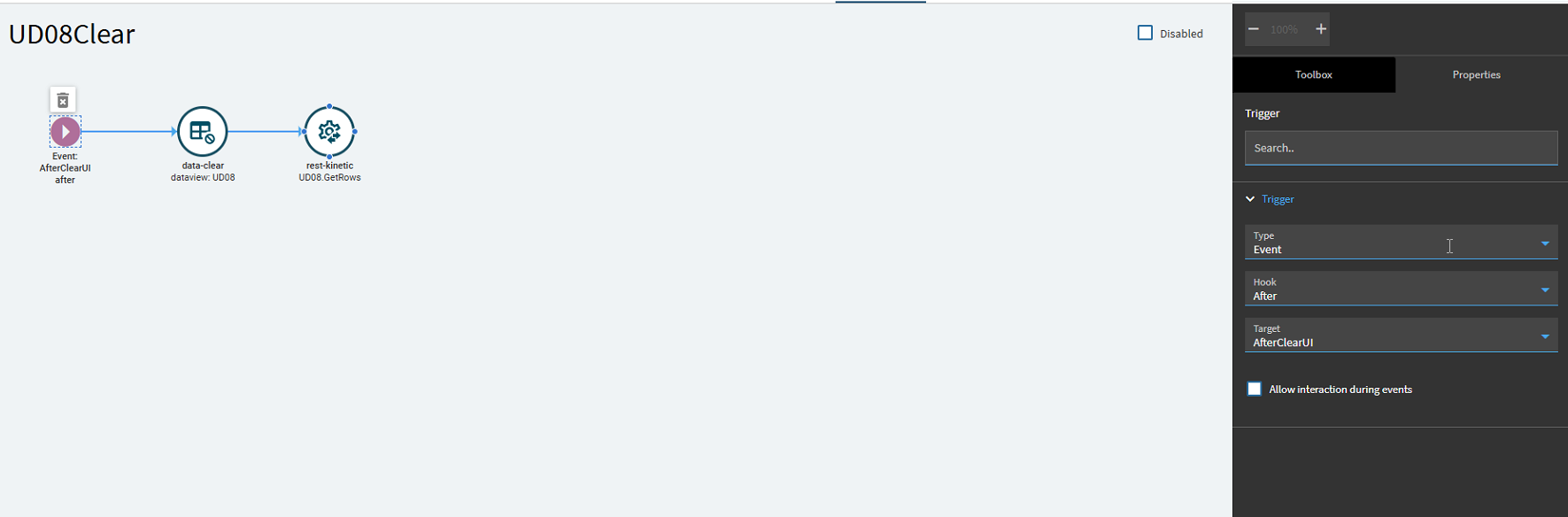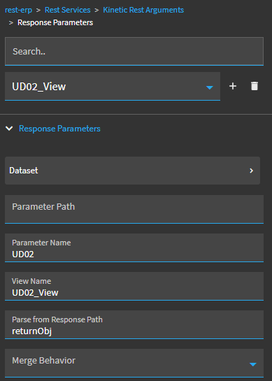 I noticed the fields I added wouldn’t clear when I pressed the clear button, so I added an event to clear the table. The data set clears, then call the rest service again to try and pull a row without a key selected so it pulls everything. To prevent lag after clear because this rest service is pulling the entire UD08 table, I went into the pageSize method parameter and limited the page size to 1. Pretty messy to be honest but also clever in my opinion so I am proud, but if anyone has a cleaner and faster way let me know.