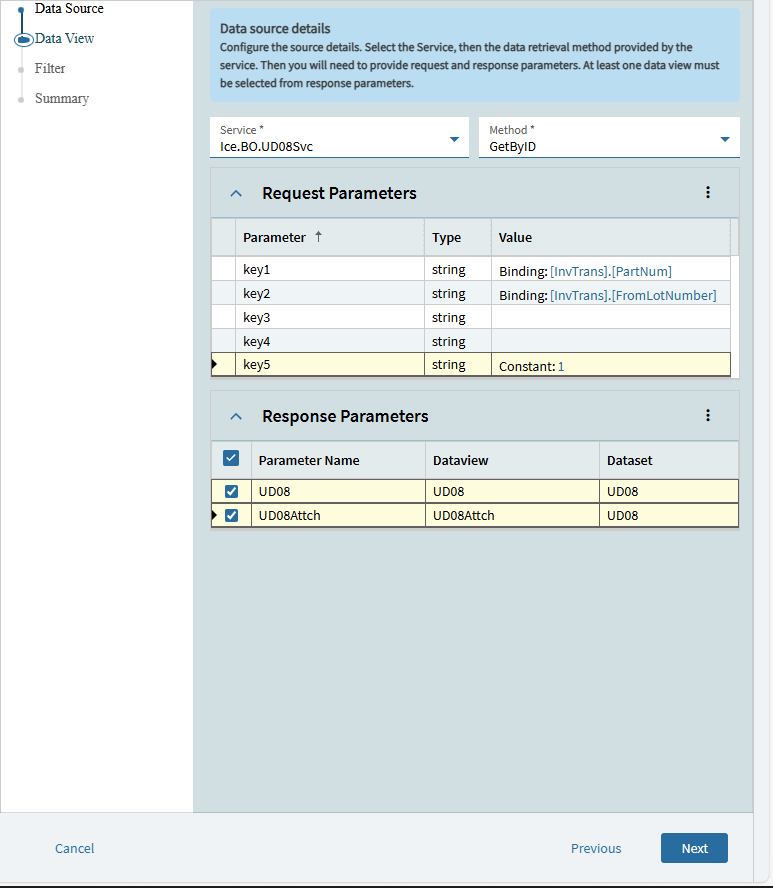 For the request parameters that depends on how your UDfield is setup, if you are getting the data from a nonUD08 table then your parameters will be different, but match the field up with your existing dashboard’s data view fields that match
