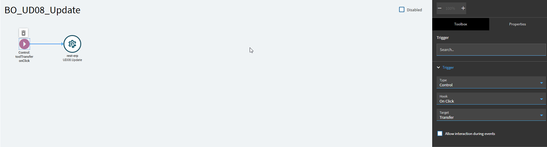 I need to update the table, so I called the BO_UD08_Update service, the only method parameter needed is the dataset field, and I called it when the user clicks the transfer tool as seen above(this isnt working, ill edit the post tomorrow im done for today, I tested the update with a button click so the rest service is good just need to edit my trigger). You can change this to what makes the most sense for that dashboard, or worst case create an event for each field that triggers when that field is updated, but that was too time consuming in many ways so I went against that.