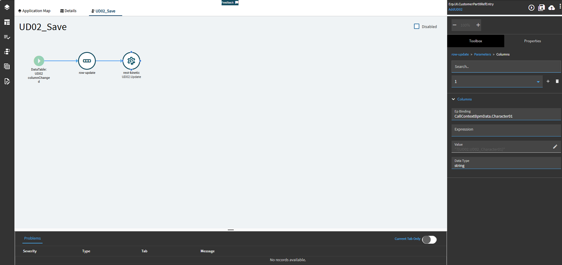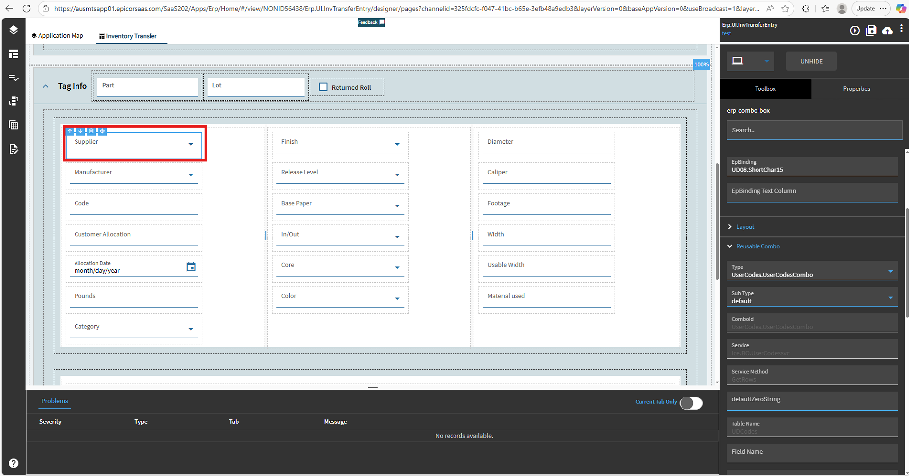 I completed this on a different dashboard, but it is simpler than the first one, so I think this serves as a better example anyways. This dashboard is inventory transfer; we have UD fields stored on UD08 that users need to update when they press the transfer button. I didn’t design this, and from a PM perspective in my opinion this probably doesn’t make a ton of sense, advanced material management is better for this, but I will fix that when I get a quote signed so in the meantime, I am recreating the dashboard in kinetic