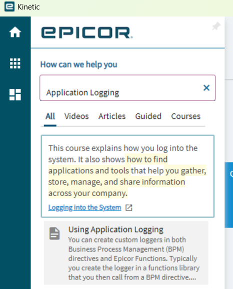 You can create custom loggers in both Business Process Management (BPM) directives and Epicor Functions. Typically you create the logger in a functions library that you then call from a BPM directive. The logger generates the application logs. Application logging captures errors and tracks specific Kinetic activity. You define what an application log captures and tracks by creating a custom logger. You can then better locate the causes of issues or capture process calls.