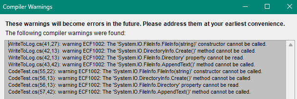 I get warnings about writing directly to a file using System.IO stuff - I guess there has been other chatter about Epicor removing these at some point (although I can ignore the warnings it does currently work on 2024.2.10):