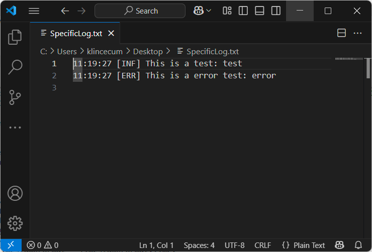 //This is based on the session, so this will write a file called "SpecificLog.txt" to the 'epicordata/Companies/YOURCOMPANY/Log' folder. (path is not exact)