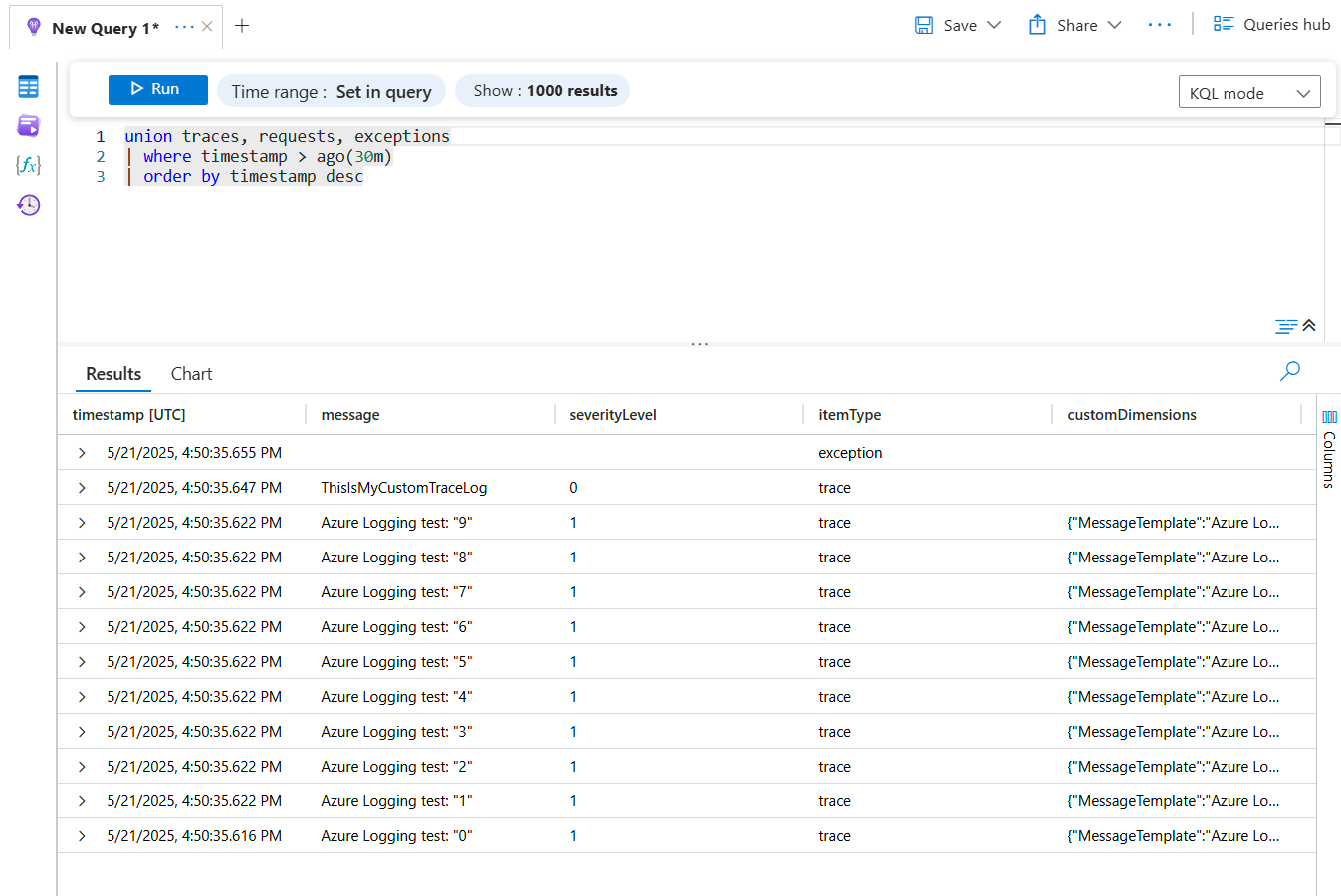 telemetryClient.TrackTrace("ThisIsMyCustomTraceLog");