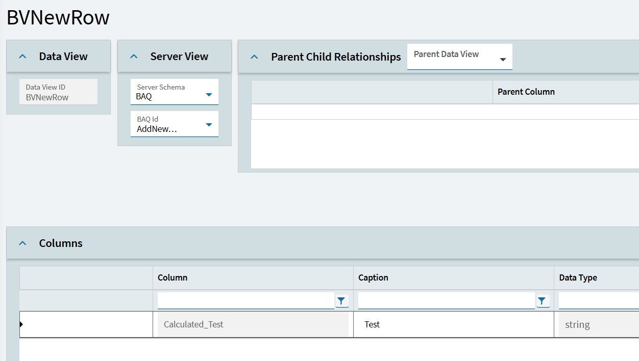 The fields get automatically added to a temporary DataView whose purpose is to hold a single row, the row to be saved to the database. The DataView is created using the same BAQ as the landing page with the grid and form. The temp DataView is never populated with data until the user clicks away after entering a field.