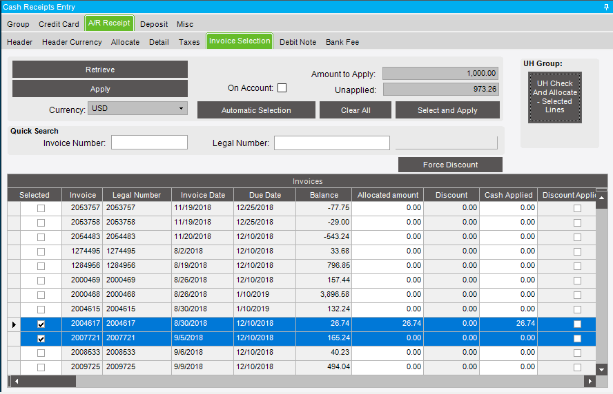 Applying checkbox to the highlighted invoices in Cash Receipts Entry via a custom button.
