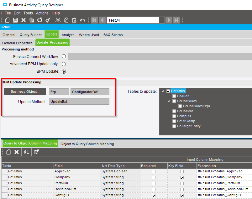 I tried importing the BAQ, got it all set up, but it looks like that our ConfiguratorDef Business Object doesn’t have any Update Methods in it.