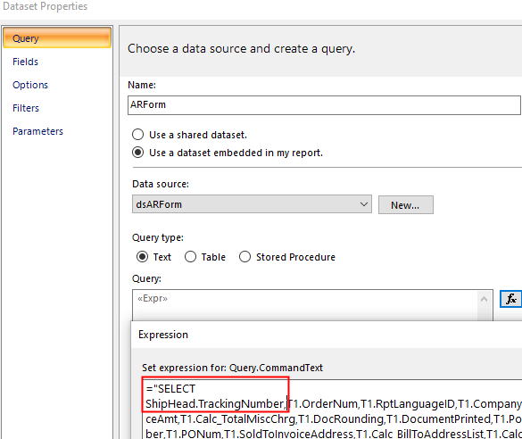 Now you have to add that in the query on your SSRS report. Open up the query and look further down than the screenshot you posted. You will see lines like LEFT OUTER JOIN TABLEX on T1.Company = TAbleX. Company… or something like that. You need to add a join in the query to reflect the join in the data set.