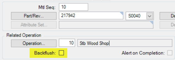 I have a part with only 1 mtl part in the BOM. This material part has ‘Backflush’ unchecked at the PartPlant level, NO BACKFLUSH.