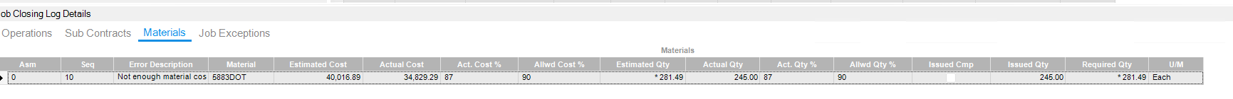 Finance is making the assumption that the EstJobCost is ProdQty*StdCost so for one of our example jobs that it completed, they calculated the following: The EstJobCost would be $40,344.60. Our -$6,089.18 variance is 15.1% of the estimated cost.