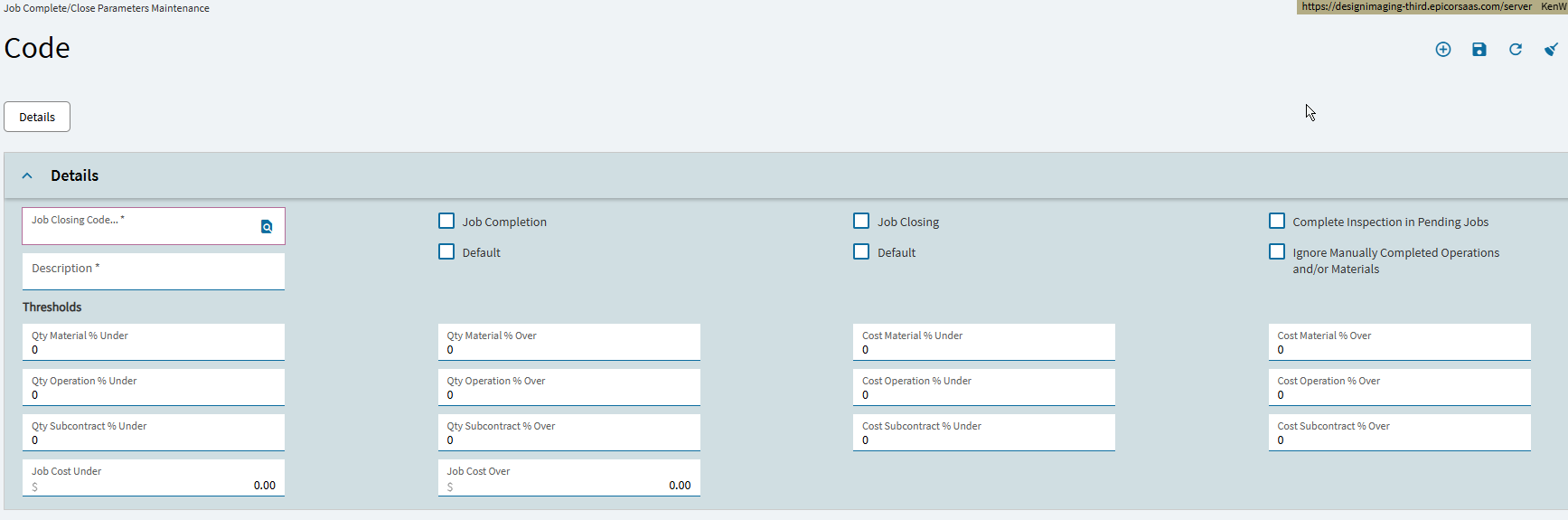 Take a look at “Job Complete/Close Parameters”. You can have separate controls for completion vs closing, as well as thresholds for over/unders thresholds for both quantity and costs for both labor, material, and subcontract. Lots of options to play with.