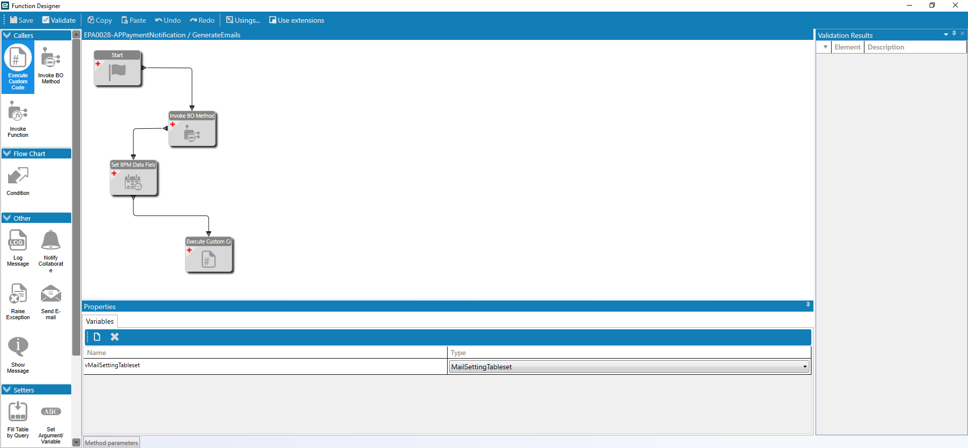 Then create a function, the BO Method call is to the MailSettings table so that I can get the “From email” address, then a custom code widget that first runs the BAQ and uses the results in the HTML email builder section of the code: