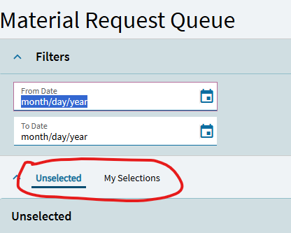 The unselected queue entries are visible to everyone. One a queue entry is selected by a user, or assigned to a user or group VIA the Material Queue Manager, the queue entry moves over to the ‘My Slections’ tab for the user(s) the queue entry was assigned to or selected by, and you won’t be able to see it anymore.