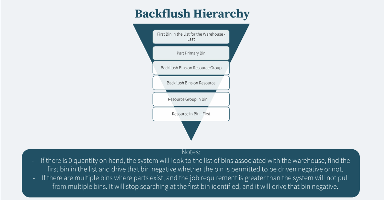 - Uses a Part Bin associated to the job material warehouse using the same tracking UOM for the component part being backflushed and if the available quantity on hand is greater than zero.