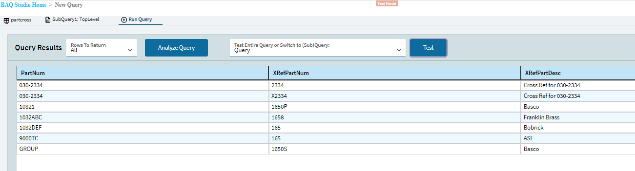 I created a BAQ to show all the data in my PartXRefInt… you can show both the real and the cross reference part. I would add a filter and select your special part above to see if there is a blank cross reference against it.