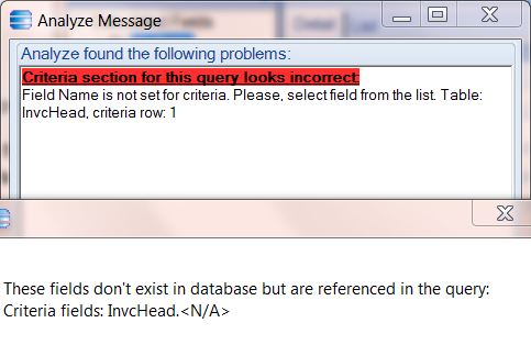 Good afternoon, gentlemen. I am just now getting back to this project again and am still having problems. It seems you are both coming at it with a little different approach. Per Calvin’s suggestion, I added the field name “InvoiceDate” and then got an error message stating I couldn’t display the invoice date or invoice number because InvcHead is a summary table. So I removed those two items from the display and now get this message.
